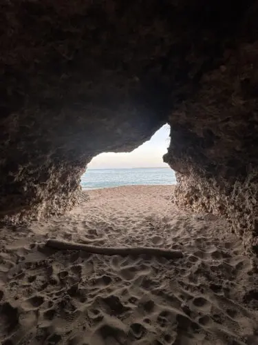 La cueva está formada en la roca costera, justo al nivel de la playa. Su entrada es baja y ancha, con piso de arena, y al entrar puedes sentarte bajo el techo de roca mientras miras el mar Caribe enmarcado por la abertura de la cueva. Es un lugar perfecto para: